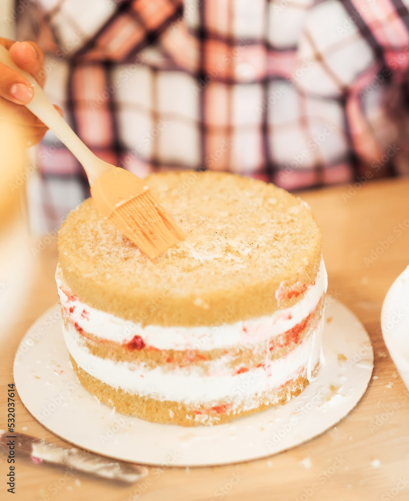Beautiful pleased pastry chef woman making cake with cream at cozy kitchen.