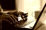 User typing login and password, Cyber security concept, information security and encryption, secure access to user's personal information, secure Internet access, data protection, cybersecurity.