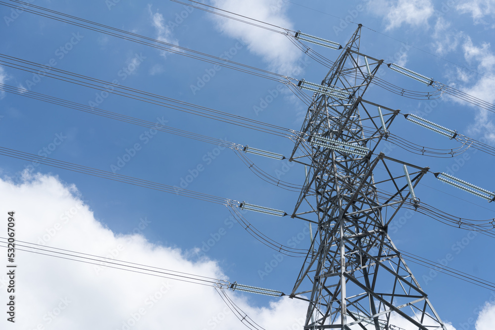 electricity transmission pylon against blue sky. high voltage electricity pole.