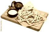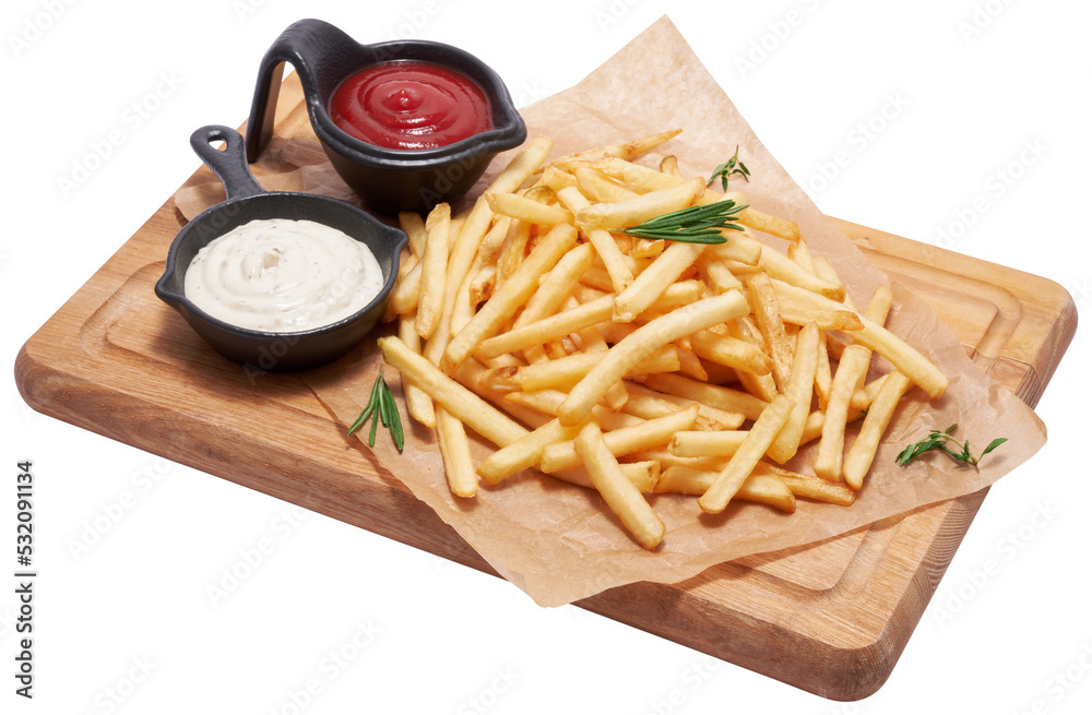 French fries potatoes on on wooden serving board