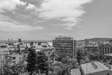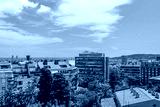 View from a rooftop to the sea and Barcelona city with modern and old buildings.