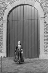 Halloween theme. Little girl in a medieval dress with an apple against the background of the large red gate of the old castle
