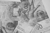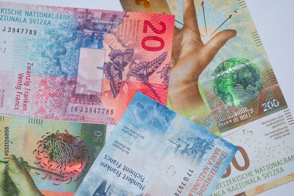 Close-up on Swiss francs in various denominations. Swiss economy