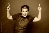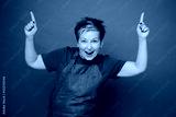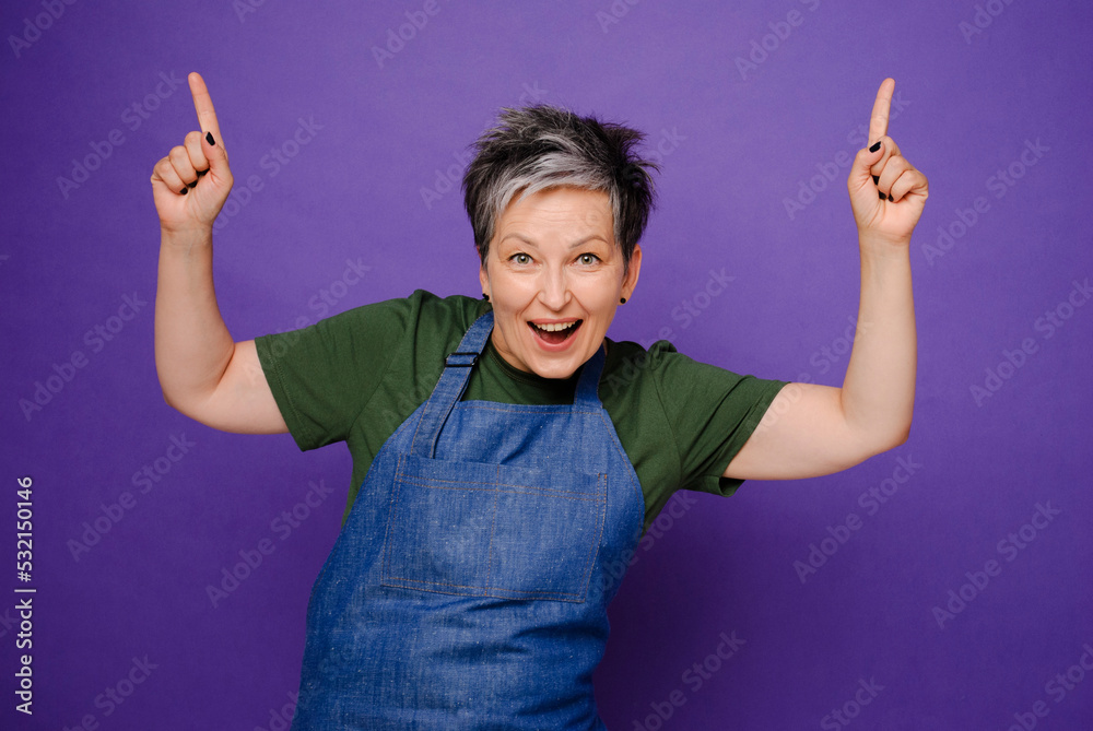 Excited attractive grey-haired woman happy and pointing by two hands and fingers above up isolated over violet background. Mature woman in apron playful pointing index by fingers above isolated