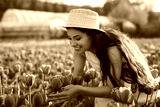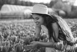 Hispanic woman smelling tulips in field