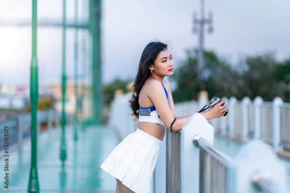 Portrait of beautiful athletic young asian woman in fashionable sportswear standing and with a holding the camera on Route walking jogging or ride bicycle and exercise on the bridge.