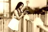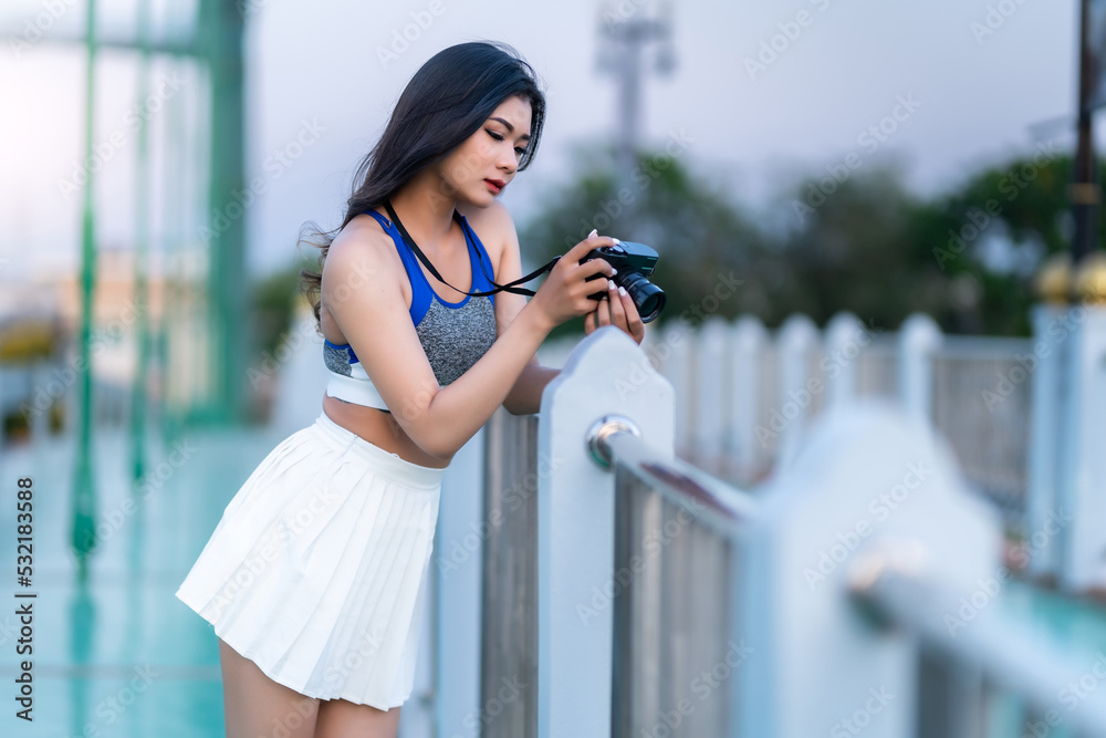 Portrait of beautiful athletic young asian woman in fashionable sportswear standing and with a holding the camera on Route walking jogging or ride bicycle and exercise on the bridge.