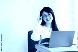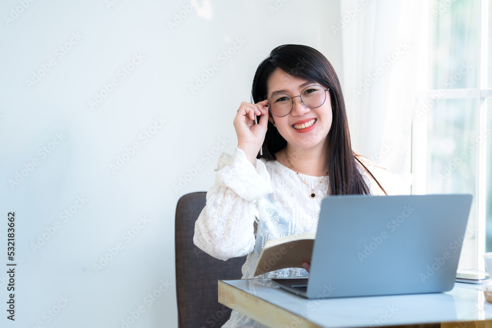 Happy of asian freelance people Businesswoman Taking written Notes to on notebook casual working with laptop computer with a coffee cup mug and smartphone at the cafe,Business Lifestyle