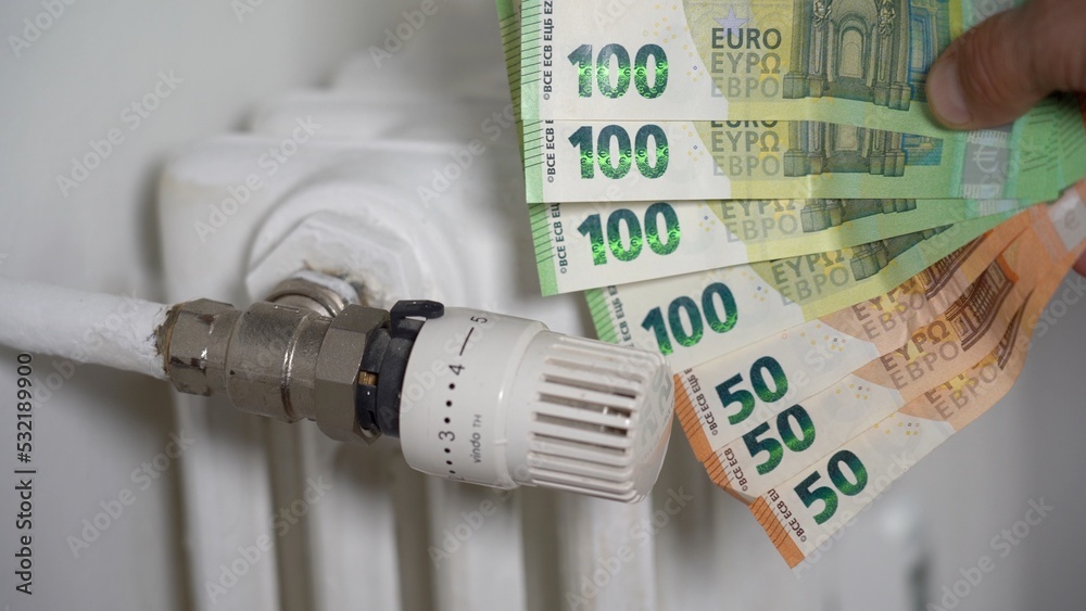 Europe, Italy , Increase in the cost of bill for gas and electricity causes increased price for the procurement of raw materials, money 100, 50 euro banknote and domestic heating radiator