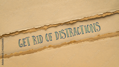 get rid of distractions motivational banner, text on handmade paper in earth tone, productivity concept
