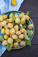 Harvest fresh yellow and red plums in summer. A plate of plums stands on a table in the garden. Healthy food concept.
