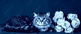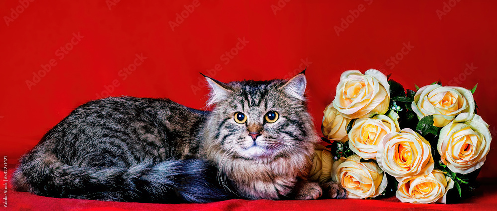 A big maine coon cat at an old clock on the red background in a sudio, isolated.