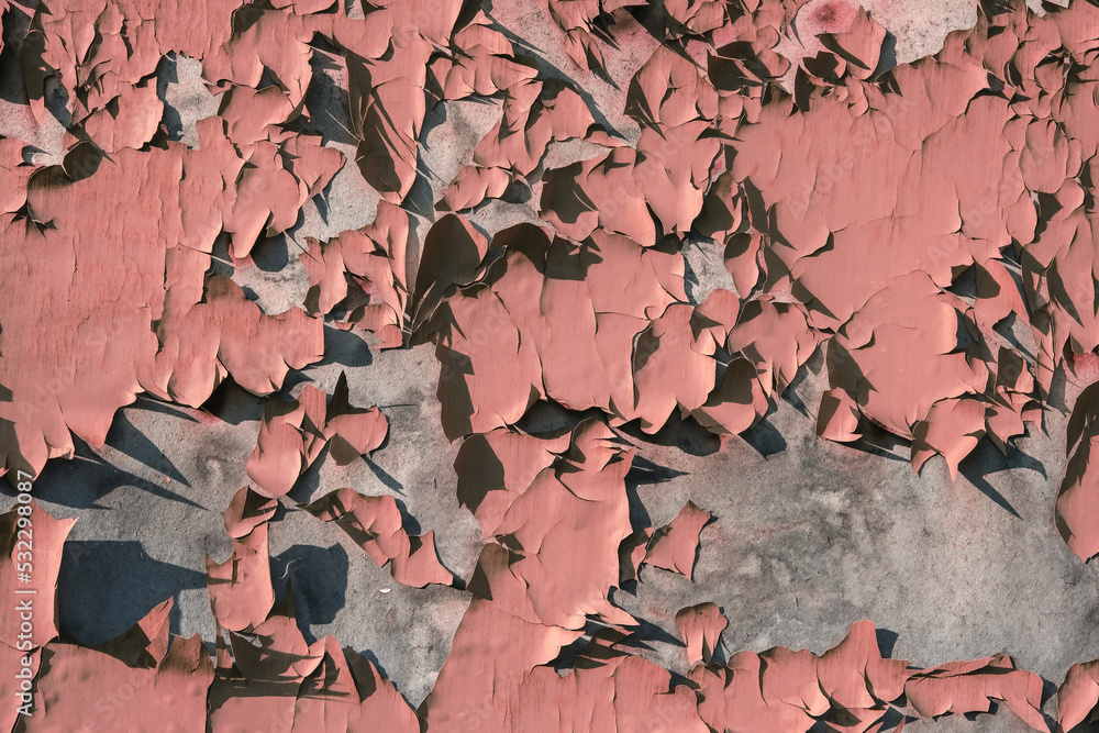 Metal background with cracked paint. The texture of the exfoliating paint of the paint. Background of old painted metal. Peeling paint on metal.
