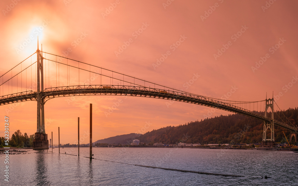 Panoramic landscape of St. John's Bridge at sunset over the Willamette River. St. John's Bridge over Willamette River, viewed from Cathedral City Park in Portland, Oregon State.