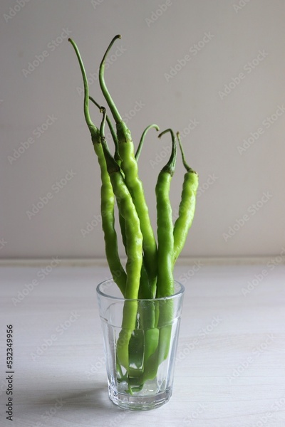 Farm fresh organic Green chili peppers. Freshly harvested healthy and spicy chilies in a basket on a green background. Copy space.