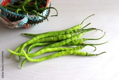 Farm fresh organic Green chili peppers. Freshly harvested healthy and spicy chilies in a basket on a green background. Copy space.