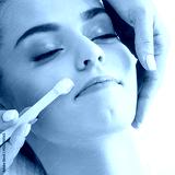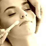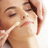 Hair removal, beauty and health concept. A young girl is getting an epilation procedure. A processional beauty worker is making depilation with hot wax.