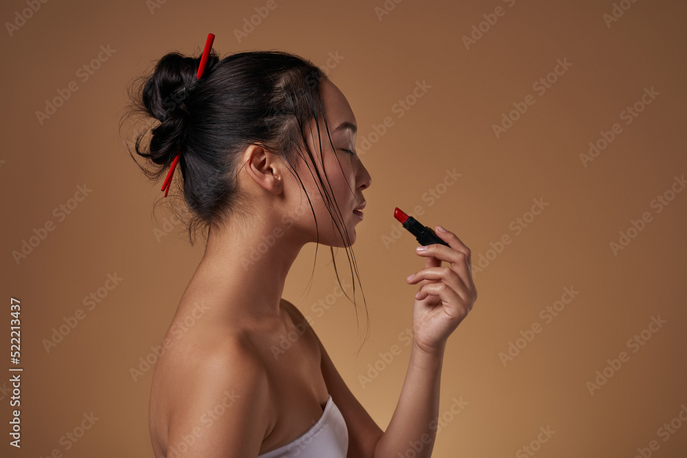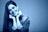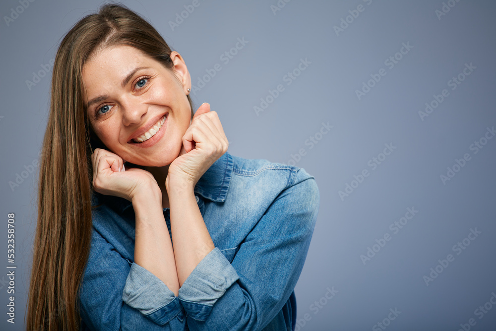 Happy young lady in blue shirt. Portrait of woman face with natural skin without makeup. isolated on blue background.