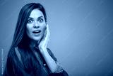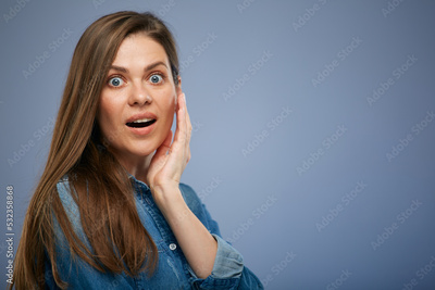Close up portrait of woman with natural surprise emotion. isolated on blue background.