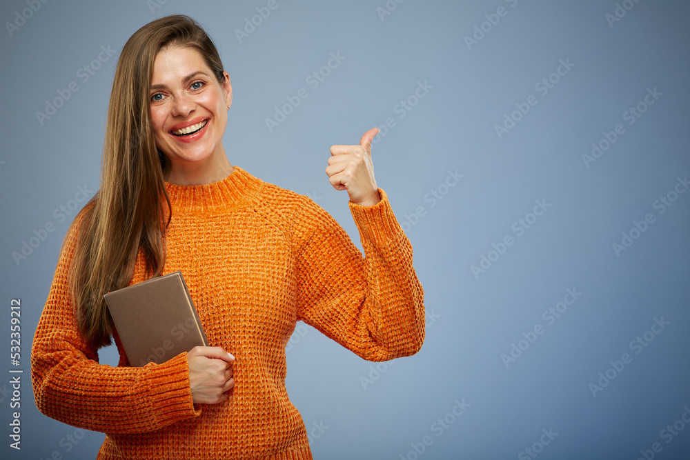 Smiling woman with book wearing orange sweater shows thumb up. isolated portrait on blue.