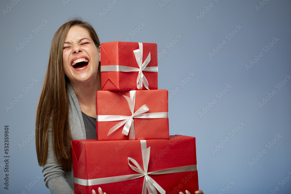 Happy emotional woman holding stack of gift boxes. Isolated female portrait. Girl celebrate Christmas or some thing more.