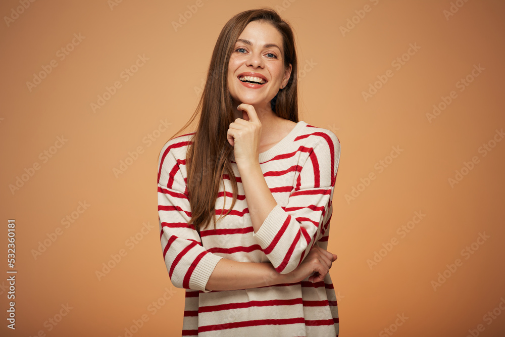 Thinking happy woman in casual sweater. Isolated female portrait.
