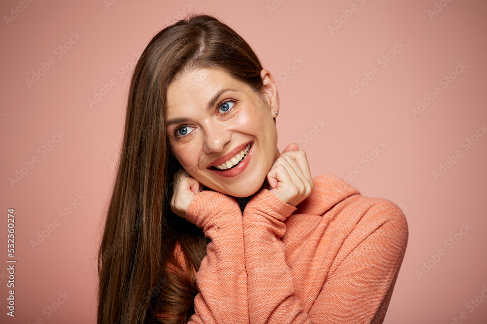 Woman face with natural real skin. Isolated portrait on pink background of smiling girl leaned on hands looking away.