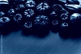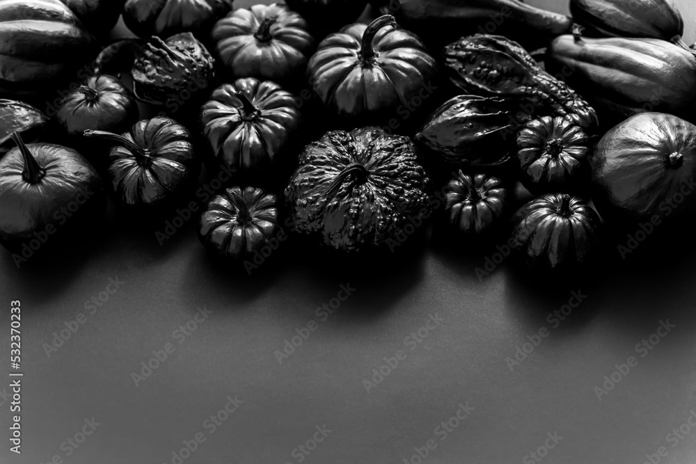 Different kinds of mini pumpkins in all black colour placed black background with copy space