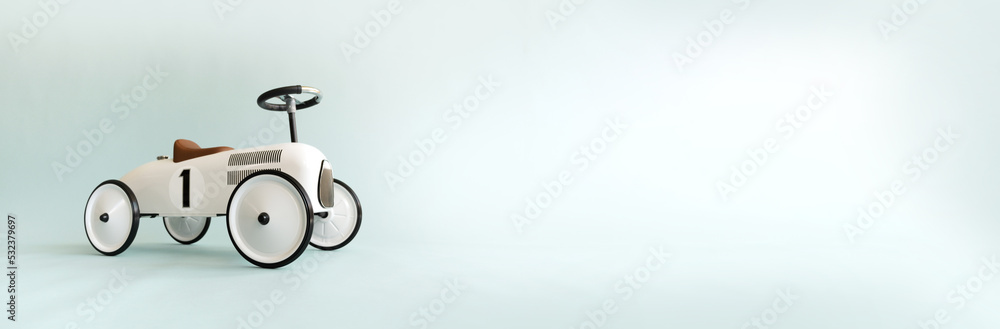 Retro style beige toy car on blue background. Stylish toy for toddler boy. Kid's playing room interior. Copyspace. Banner, ad