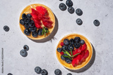 Berry tart cake on grey stone background. Beautiful tartlets with cream, jelly, fresh strawberry and blueberry on the table