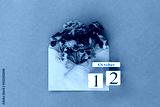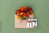 October 12. Bouquet of orange flower in craft envelope and calendar date on green background. Minimal concept Hello fall. Template for your design, greeting card
