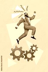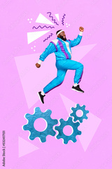 Vertical creative photo collage of motivated crazy inspired guy run to get good shape cogwheels isolated on pink color background