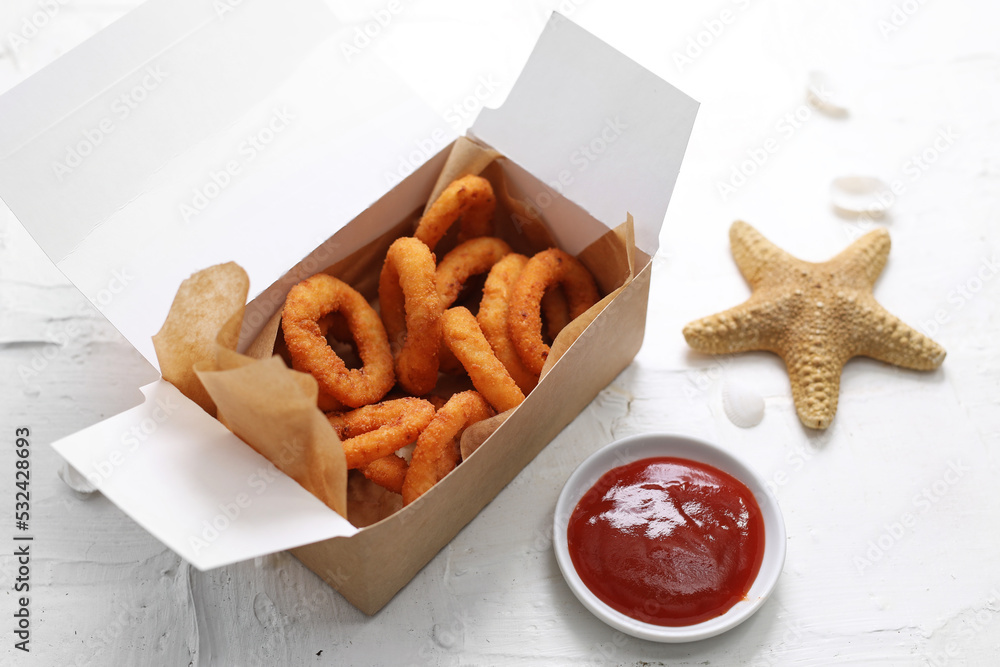 Deep fried squid rings and a tomato sauce, ketchup, on a white background. Panko calamari in a takeaway carton box.