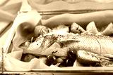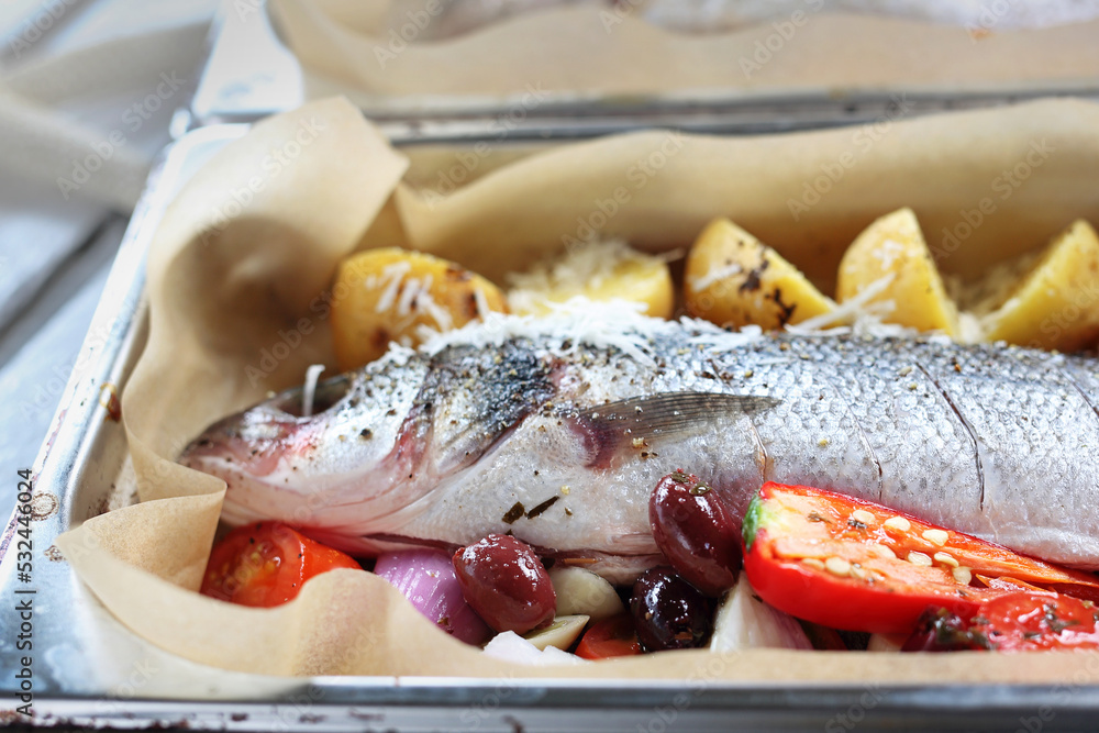 Sea bass with vegetables in a baking dish, close-up. Baking fish in a sheet pan lined with parchment paper.