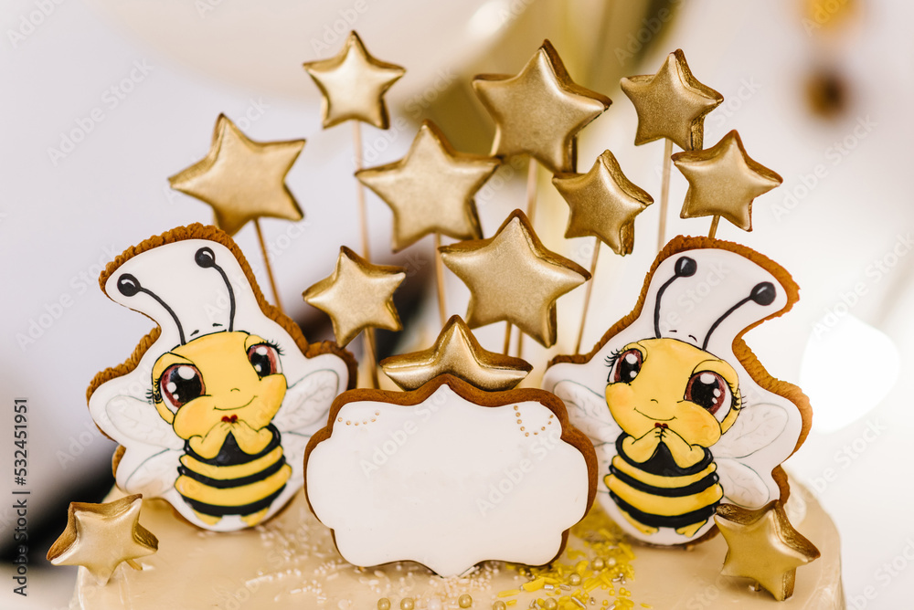 Cake in golden style and decorated with bees. Bee, honey, baby shower party, newborn baby party, birthday party concept design, decorations. Cake Decorating.