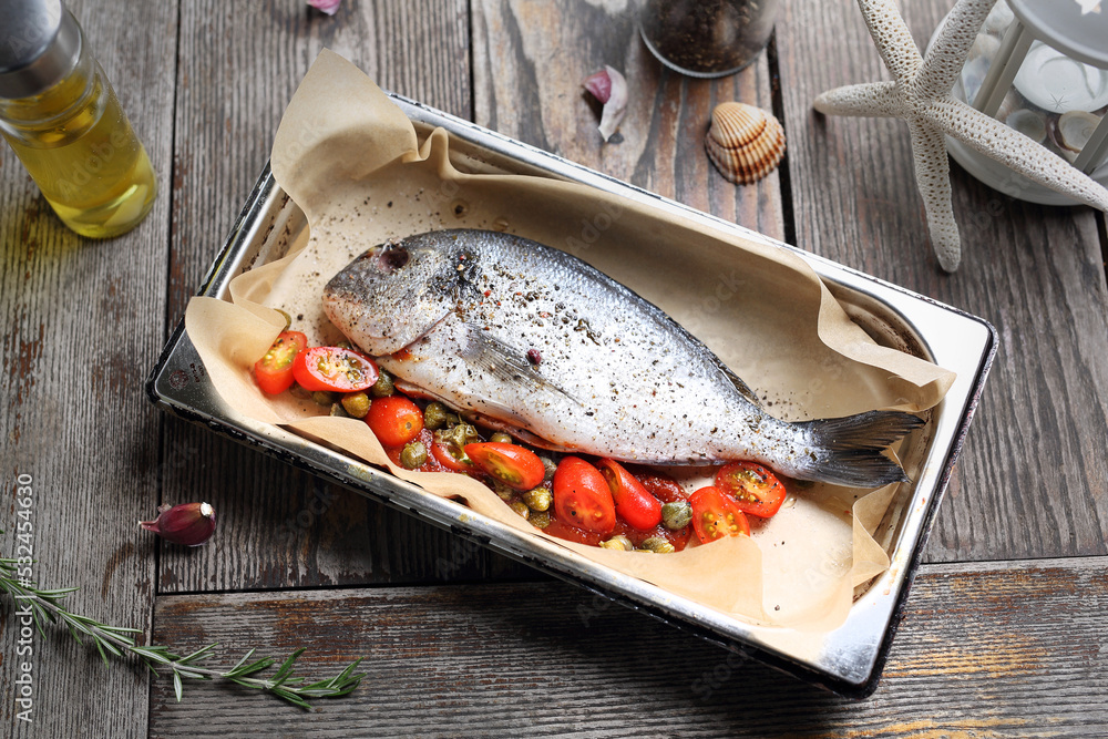 Whole sea bream with vegetables in a baking dish, top view. Baking fish in a sheet pan lined with parchment paper.