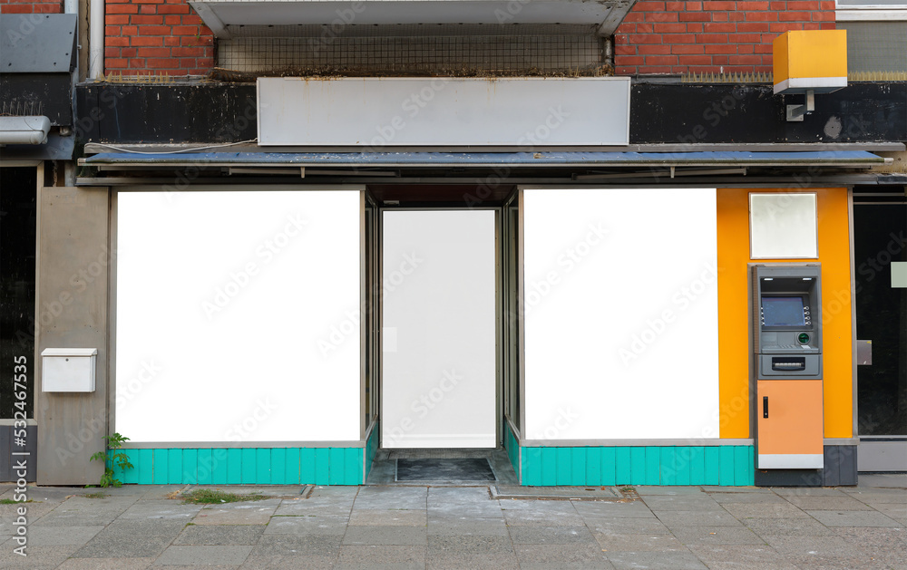 abandoned shop in the urban city near sidewalk, empty store with empty blank windows.