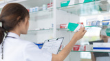 Pharmacist women are supplying prescription drugs to customers, Pharmacists work in a pharmacy, Drug store shelf with prescription medication, Clipboard at the hospital pharmacy, Community Pharmacy.