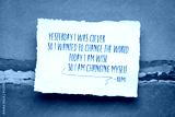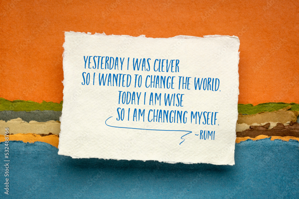Yesterday I was clever so I wanted to change the world. Today I am wise so I am changing myself. Inspirational quote from Rumi on handmade paper, personal development concept.