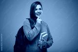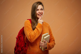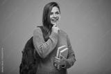 Thinking student woman with book and red backpack. Isolated female portrait. Girl looking away.