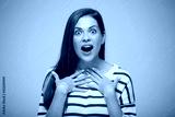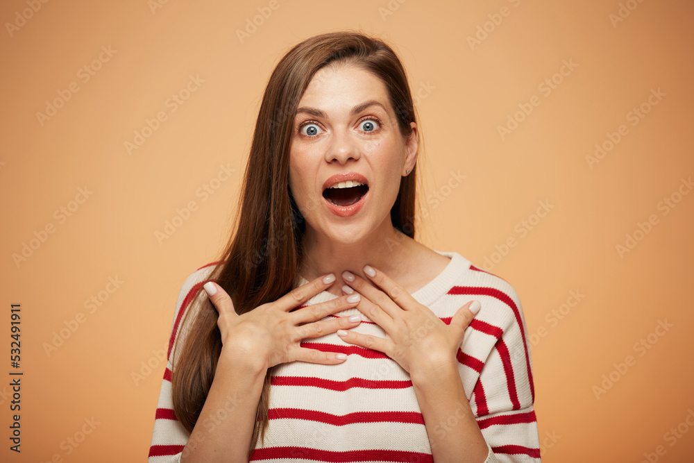 Amazed woman in casual striped clothes. Isolated female facial portrait.