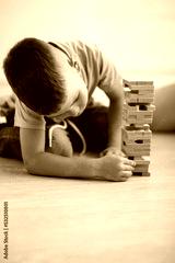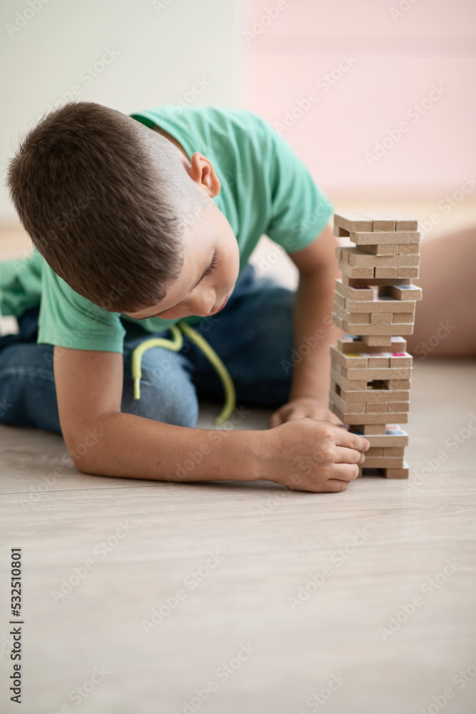 a boy plays a fun board game of laying wooden blocks in a tower and completing tasks sitting on the floor at home