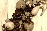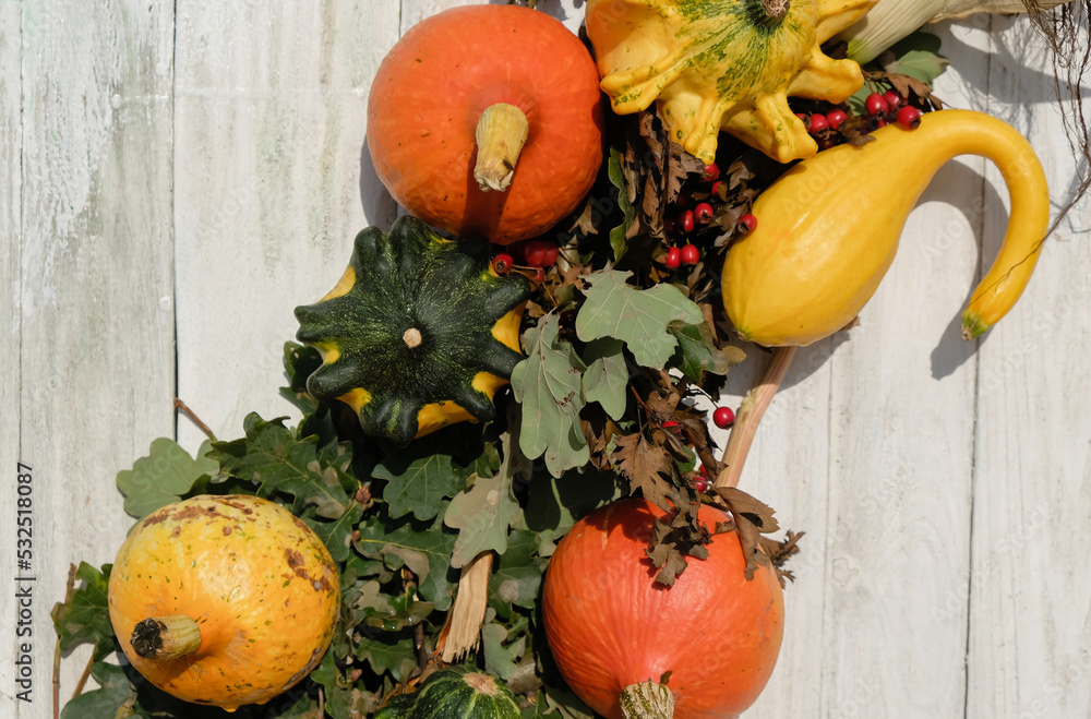 The wooden wall is decorated with pumpkins, oak leaves, and red hawthorn berries. Sunny. After rain. Copy space.