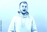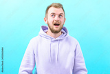 A surprised man in a purple hoodie looks up with an open mouth on a blue background. Feeling. Facial. Friendship. Good. Joyful. Posing. Positive. Pose. Opened. Amazing. Teenage. Beard. Idea. Indoor