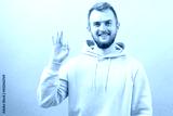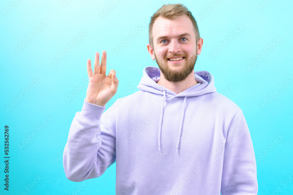Man in a purple who is showing OK gesture on his hand on a blue background. Gesturing. Handsome. Happiness. Smart. Professional. Job. Alright. Positively. Fine. Well. Perfect. Fair. Exactly. Correct