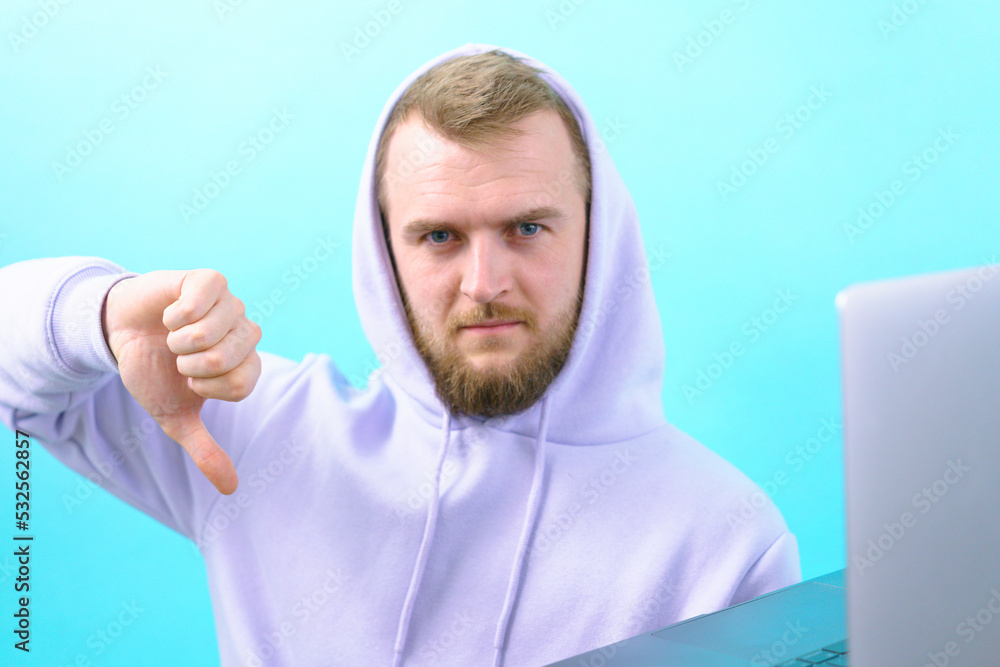 Sad man showing his thumb down and holding a laptop on the blue background. Casual. Hand. Lifestyle. Confidence. Connection. Gesturing. Entrepreneur. Expertise. Expression. Employee. Joy. Good