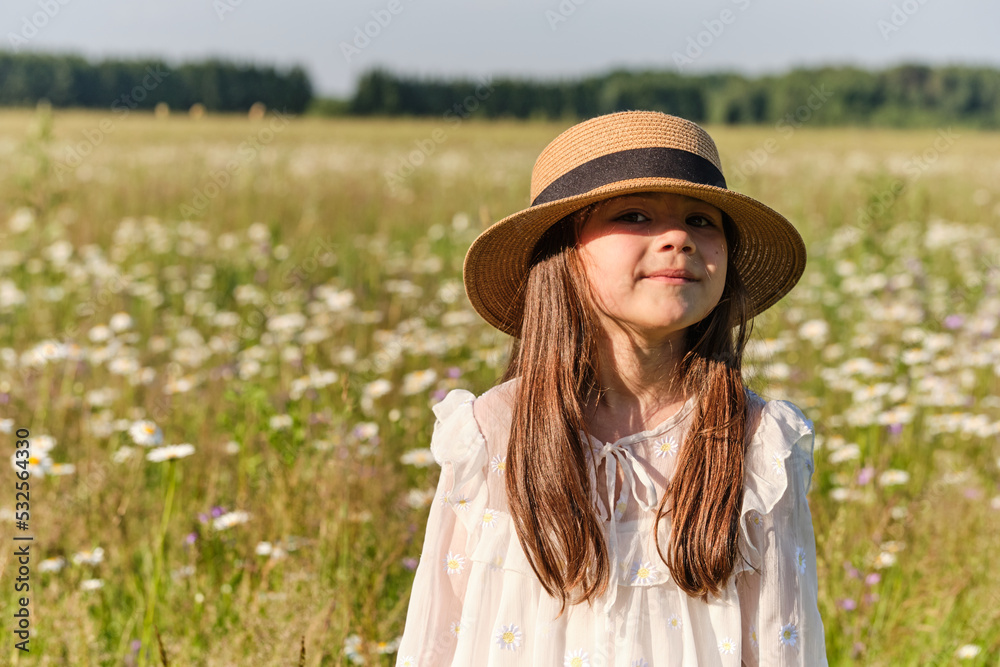 Portrait of a little smiling girl in a white dress and a straw hat on a chamomile field on a bright sunny summer day