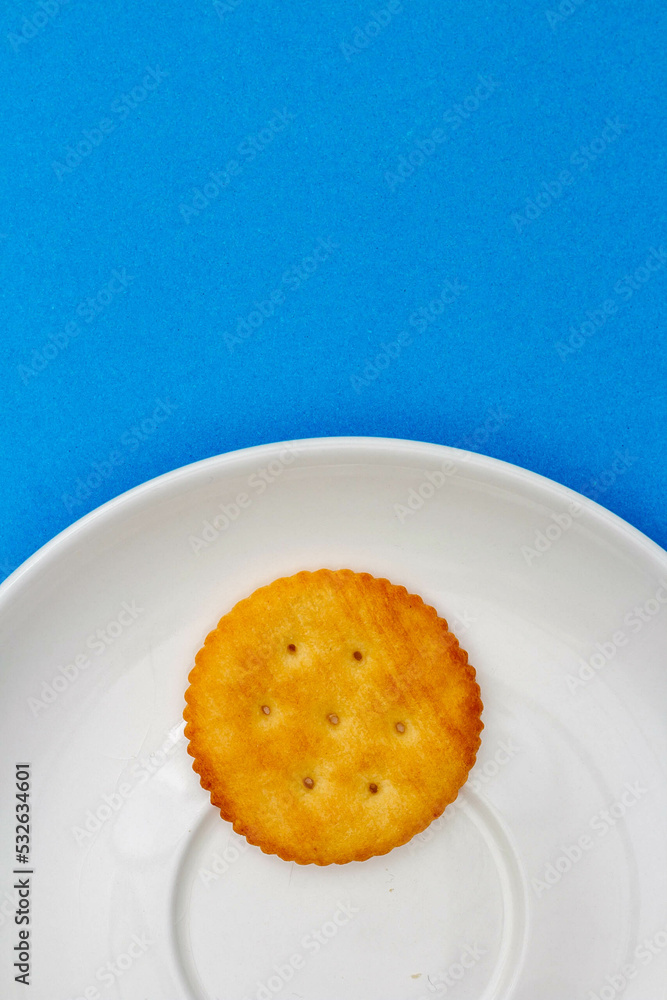 Snack concept, Salty crackers or biscuit in white plate isolated over light blue background
