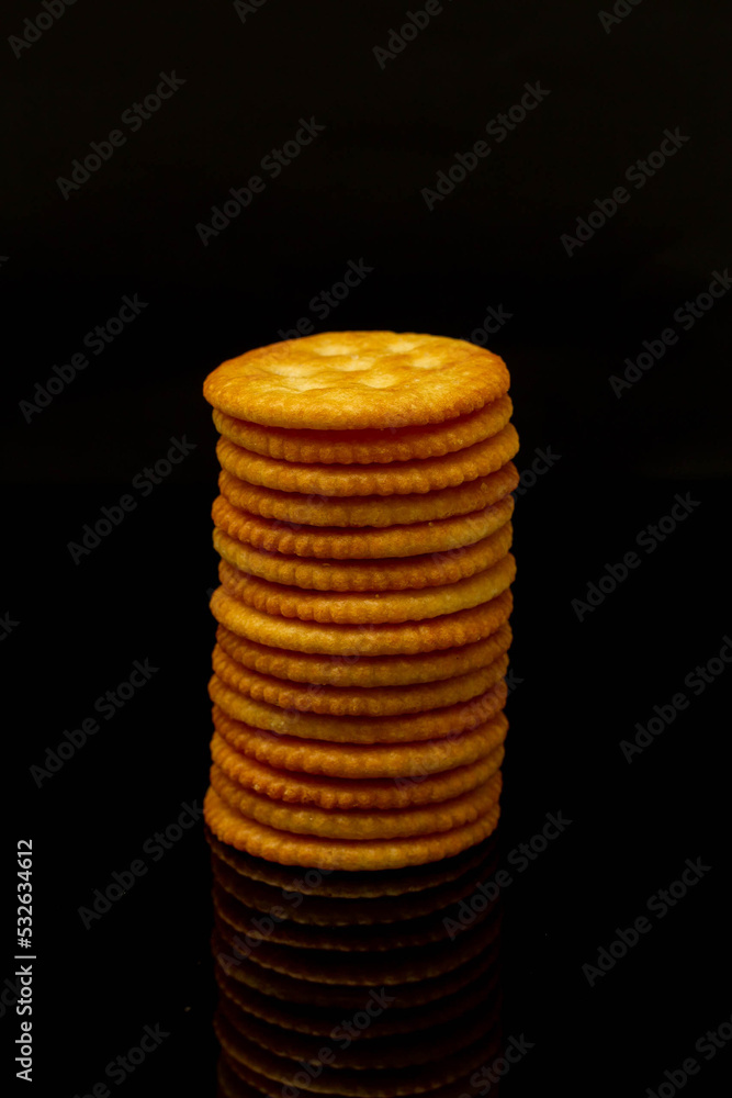Snack concept, Salty crackers or biscuits arranged in vertical row isolated on black background