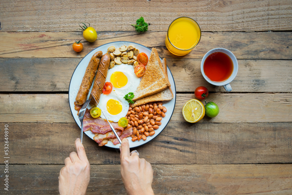 Top down view of woman hands slicing sausages